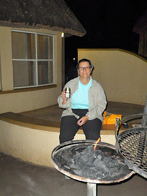 Nous sommes de retour au camp à 5 heures et demie. Nous passons à la réception du camp pour réserver un safari matinal pour demain matin et un safari nocturne pour après-demain. Nous passons ensuite au magasin acheter du charbon de bois et de quoi mettre à griller au dessus des braises : bœuf, ce soir, et côtelettes de springbok, demain soir ! Par contre, côté accompagnement, le choix n'est pas terrible. Nous décidons que nous mangerons les crackers que nous avons achetés à "White River", il faut bien les finir. Après avoir allumé le feu, nous sirotons notre seconde bouteille de vin blanc en attendant que la viande grille. Ce barbecue est bien meilleur qu'un hamburger du restaurant, même avec des crackers.