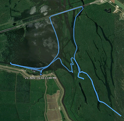 Après ce canal où les observations ont été très florissantes, le pilote remonte ensuite un autre canal où nous observons d'autres alligators, moins gros que ceux que nous venons de voir. Certains sont même à l'ombre, c’est certainement signe que l'hibernation n'a pas encore vraiment commencée. En revenant vers "McGee's Landing", nous observons de loin quelques oiseaux, aigrettes ou hérons cendrés, mais ceux-ci s’envolent en nous attendant arriver de loin. L'"airboat" n'est pas l'engin qu'il faut utiliser pour observer les oiseaux, c'est incontestable mais ce moyen de locomotion est tout même amusant. La pilote nous fait d'ailleurs faire 2 tours à toute vitesse sur nous-mêmes à 360 °. Ca vire dans un mouchoir de poche, cet engin ! Nous sommes de retour au ponton de départ à 14 heures passées de 10 minutes, ce n'était heureusement pas chronométré à la minute près.