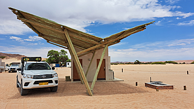 Nous nous installons ensuite sur notre emplacement de camping : petite salle d’eau (avec une douche et un lavabo) et toilettes privées, bac pour la vaisselle, un coin pour le feu et une grande avancée en bois pour faire de l’ombre. C’est camping grand luxe ! Nous nous reposons un peu (Anne-Marie en profite pour régler son stabilisateur de caméra) avant de repartir vers 15 heures pour nous rendre à Deadvlei. Le temps est gris à Sesriem mais Christophe pense que vers l’ouest, vers Deadvlei, nous aurons des éclaircies (prévisions au pifomètre à cadran mobile). Et en effet, après les 60 km de route goudronnée, quand nous arrivons au parking situé avant la bande de sable, des belles éclaircies sont présentes au-dessus de Sossusvlei.